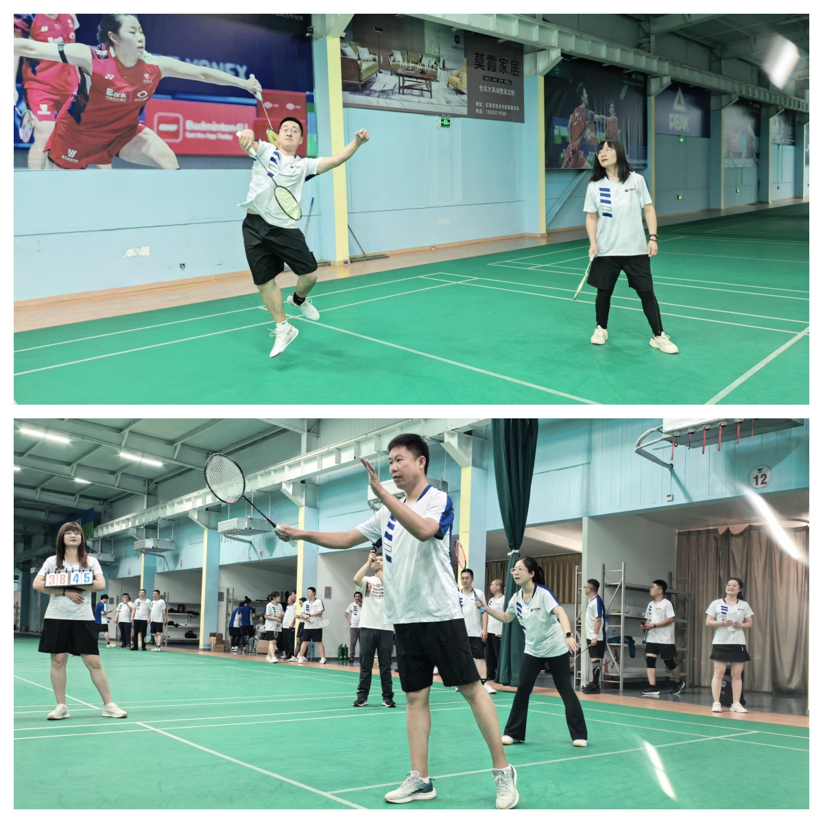 比赛在热烈而友好的氛围中展开,白色的羽毛球在空中划出一道道优美的弧线,每一次精彩的攻防都扣人心弦。整个赛场不仅充满了紧张的竞技气氛,更洋溢着欢声笑语和同事间的深厚情谊。